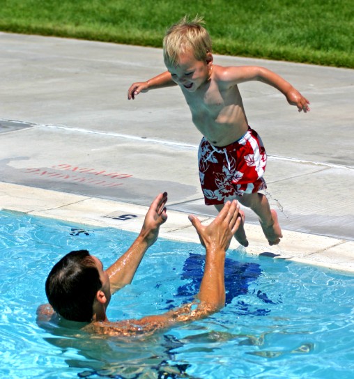 Now, you have never jumped from one meter high and you can’t swim and your daddy is not underneath you and this water is way over your head. How do you make your daddy look good in that moment? You jump. And almost as soon as you hit the water, you feel his hands under your arms and he treads water holding you safely while someone chases the dog away. Then he takes you to the side of the pool.